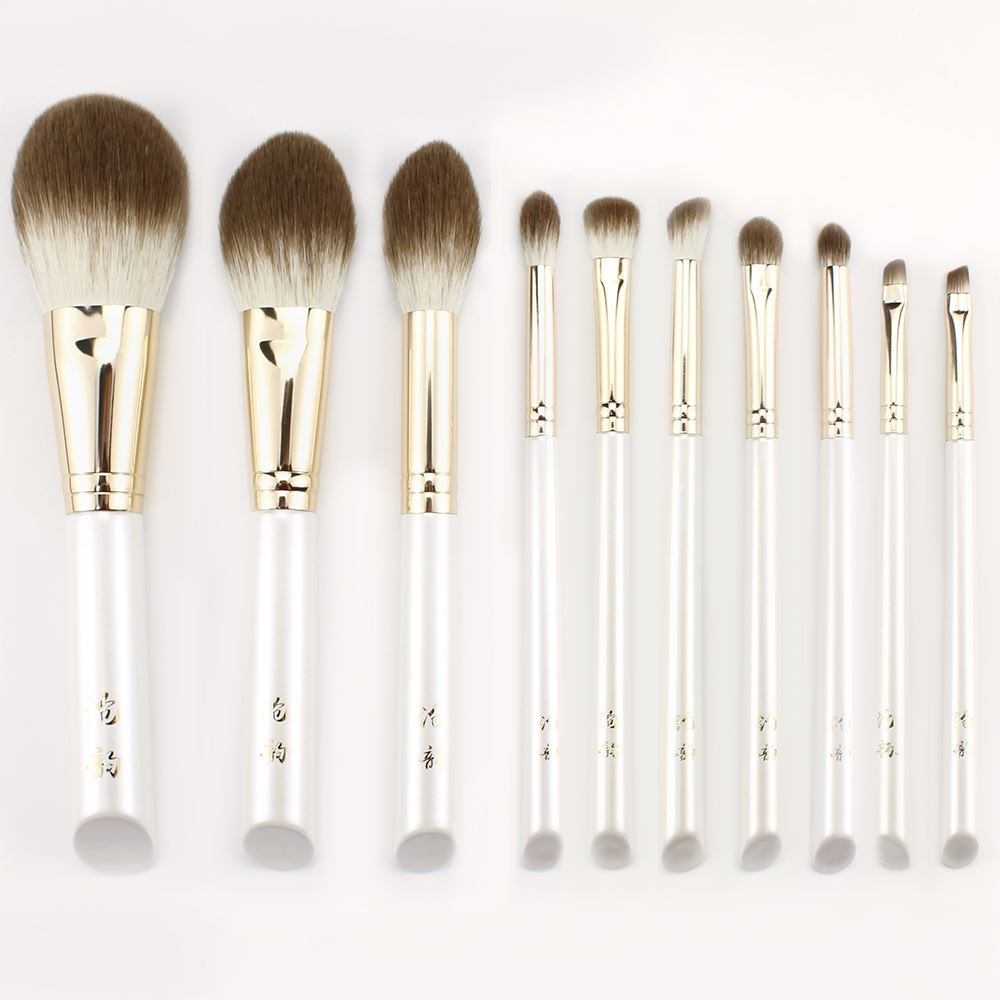 Signature Slant-Cut Pearl Handles: The handles feature a unique, angled base (slant-cut) that isn't just for show-it provides a stable grip and prevents the brushes from rolling off your vanity. Each handle is crafted from high-quality wood and finished with a multi-layered pearlized lacquer for a sophisticated, luminous sheen.
